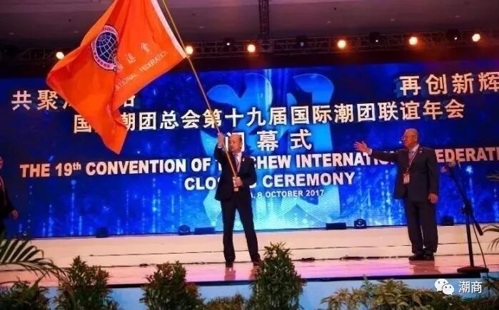 2017年10月,在第十九届国际潮团联谊年会闭幕式上,新西兰潮属总会主席张乙坤接过国际潮团总会会旗