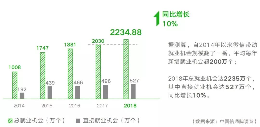 由微信、中国信通院、数字中国研究中心共同发布的《微信就业影响力报告》显示,2018年微信带动就业机会达2235万个,同比增长10%。其中,带动直接就业机会527万个,小程序带动就业机会182万个。
