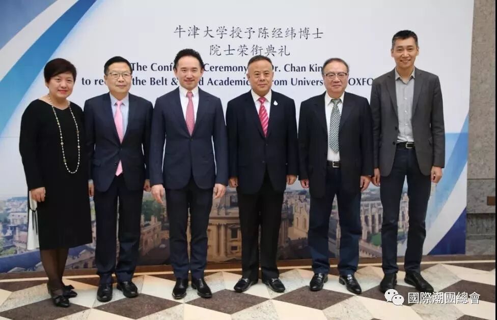 2019年5月15日,国际潮团总会荣誉会长、香港中国商会主席、香港经纬集团主席陈经纬博士荣获牛津大学颁发院士学位。学位授予仪式在上海西郊宾馆会议中心百花厅举行,由牛津大学领导力和公共政策项目主任Alan Edward Hudson教授亲自颁发,以表彰陈经纬博士自2014年以来为“一带一路”建设作出的贡献。复旦大学、上海交通大学、同济大学、上海大学代表及英国领事馆政治处领事Marc Connolly先生等,海内外及各界代表一百多位嘉宾出席见证了仪式。