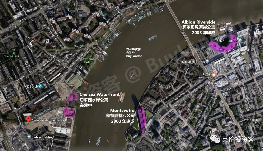 就在2003年蓬特威特罗公寓的对面,和记黄埔又开发了新的公寓Chelsea Waterfront。该项目占地8.8英亩、拥有600米长的滨河区域。两栋塔楼分别高37层和25层。