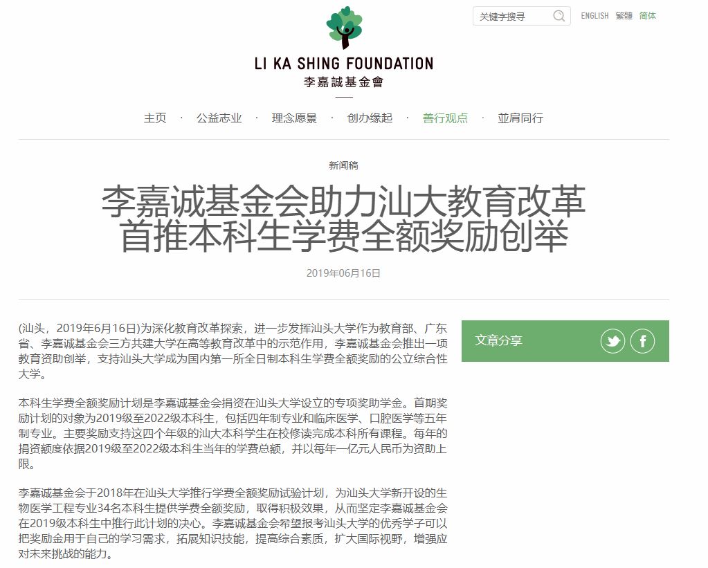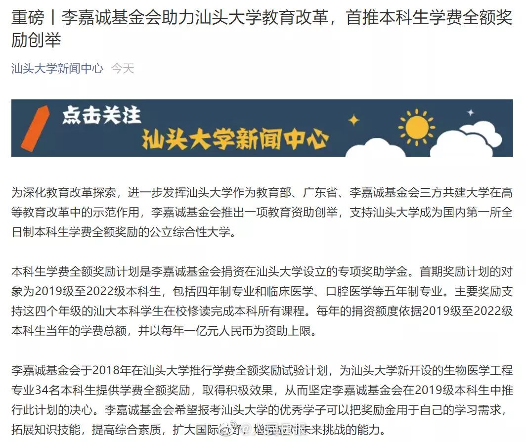 由此,汕头大学成为国内第一所全日制本科生学费全额奖励的公立综合性大学。据汕头大学新闻发布会介绍,这是为深化教育改革探索,进一步发挥汕头大学作为教育部、广东省、李嘉诚基金会三方共建大学在高等教育改革中的示范作用,李嘉诚基金会推出的一项教育资助创举。