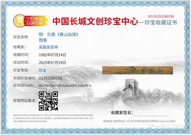 2004年元月十二日上午,我和夫人前往拜候史树青先生,进门一听我们带仇英青绿山木手卷,欣然起床简单吃过早点,打开此卷高兴至极说“我看了很多仇英的作品,大都为假,此件映入眼帘的景物以及刘墉、翁方纲二跋,仿佛暖流入心房,真迹无疑。”接着十分严谨仔细地查阅印鉴和仇英相关的资料,真让我们等得不耐烦,直至下午五时(他自己午饭也顾不上吃),便研墨题书:仇十洲春山仙馆图卷绢本,青绿工笔精绘,图中群山环翠、乔松参天、农牧生活怡然自乐,作者有世外桃源之想,其中楼阁高耸者,即人间仙境也!卷后有翁方纲、刘墉二跋。翁诗称此山此景果有无,妙意细入穷锱铢,益赞作者写景入微,用笔独到。艺林珍品之意。卷后楷书“仇英实父制”五字,款下钤篆书朱文“十洲”葫芦印,卷上钤有朱文篆书“子京父印”,项墨林珍赏,“子京之印”,墨林秘玩,朱白文“墨林生印”。“流传有绪世以为宝沐手卷舒晴窗一日可以百回看矣!2004年6月史树青谨跋。”史老的严谨治学精神。让我教益匪浅。