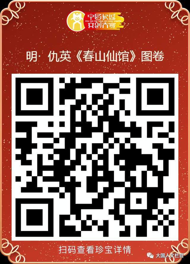 明代四大画家之一,漆匠出身的界画大师、摹古高手仇英先生,曾客居过富家和收藏家,主要有三家:如昆山鉴藏家周凤来家就有六年之久;中年时客居最久的是明代大收藏家项元汴的天籁阁,此《春山仙馆》图就是其盛年大作;仇英最后生命就在苏州富商陈官家渡过。他生如浮萍,死如迷雾,来去无踪,只留如椽画笔,屹立人间千古,吞吐四方风云,乃至于千百年后,我们仍无法明了,仇英的青春年少、爱恨情仇,他究竟何年、何地、何故离开人世?当我们在他留下的辉煌画作间流连徘徊时,依稀可以听见在历史之深处,传来了一声若有若无的叹息……